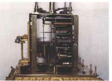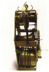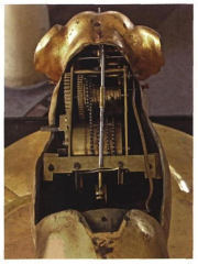 钟表的顶部,有一个大圆滚子,它能播放音乐,跟着音乐可以动。前边密密麻麻的小零件用于计时,可以报时、报点。