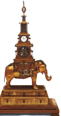 修复好的铜镀金象驮宝塔变花转花钟,长 57 厘米、宽 32 厘米、高 122 厘米,錾花纹铜镀金底座上站立大象,象的身披镶嵌着各色料石的花瓣。控制大象活动的机械置于腹内,弦孔在鞍上。象背驮四层方塔。底层正面的转花可变换 4 种形状和颜色;二层正面镶嵌三针时钟;三层、四层中心嵌料石柱和四角嵌料石柱都能转动,亭顶有菱形花。