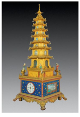 铜镀金嵌珐琅升降塔问乐钟是杨晓晨早期接触的作品,这件清代乾隆年间中国广东生产的升降塔式钟表,其外观构件以铜鎏金材料为主,兼以多处广珐琅配合铜版画进行装饰。