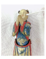 需要对四尊童子像整体除尘,并用岩彩固色和补色。首先进行整体除尘清洁,先用软毛笔扫去雕像表面的浮灰,因为施色部分存在龟裂现象,所以动作要轻慢、柔缓。随后清理面部和手部无施彩处的灰尘。