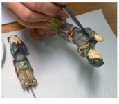 然后以毛笔在施色部位蘸扫固着材料,需要特别注意龟裂、起翘部分,多次涂抹直至完全贴合。