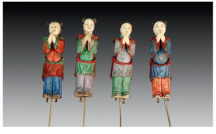 底层四角的四尊童子均为象牙所制,头梳双髻,上衣下裤,腰际束带,肩头以牙钉固定飘带。由于常年置于展柜,防尘不当,四童子通体积灰严重,甚至沁入牙体的细缝中。加之长时间暴露在空气中,童子身上施色的部位出现了非常严重的脱色、褪色。