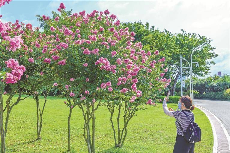 与此同时,深圳湾公园中湾阅海广场出现了一条花团锦簇的“紫薇小道”,浓烈的色彩一如深圳热烈的夏天。从深圳湾公园地铁站A口出来,向着海边的中湾阅海广场迁鸟书吧走去,不一会便能走进这条百米长的“紫薇小道”。小径蜿蜒,芳草如茵,开着粉紫、粉红、大红色花朵的小叶紫薇随风摇曳,靓丽可人。这条“紫薇小道”又被网友称为“紫薇花路”,深圳湾是深圳密集种植紫薇花的公园之一。